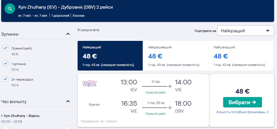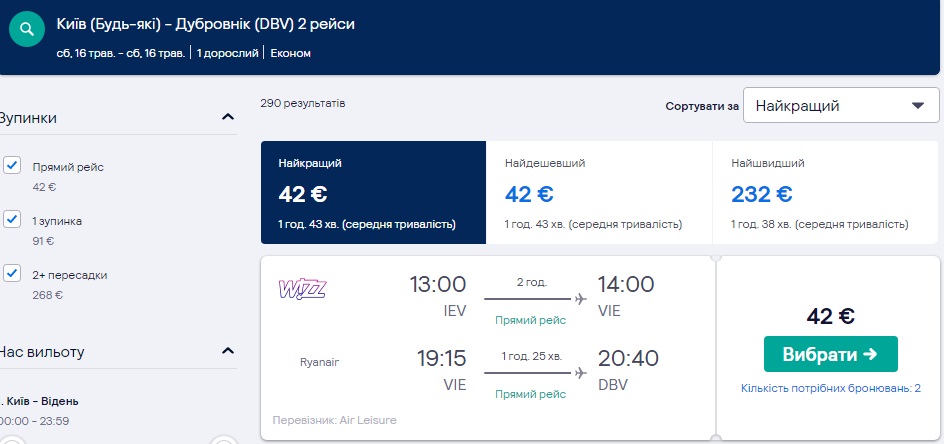 Підбираємо рейси у Wizz Air, Ryanair та Laudamotion і летимо до Хорватії – від €42 в один бік або €105 туди-назад. Переліт здійснюється зі зручними пересадками у Відні.