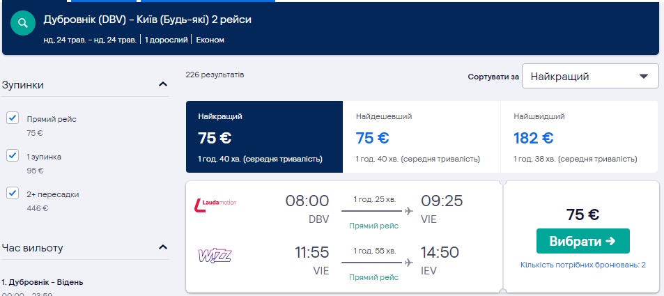 Дубровнік-Відень-Київ (24.05.2020) – €75