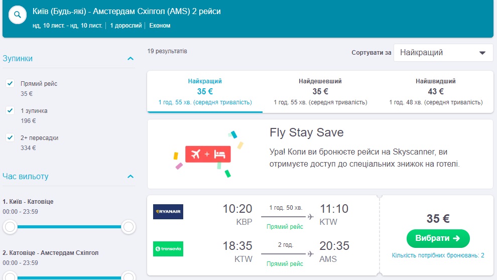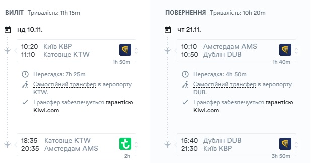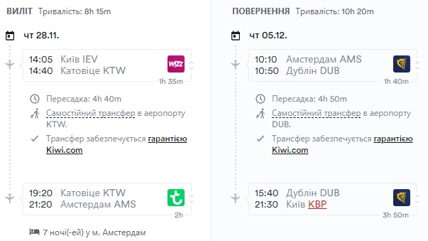 Бюджетні рейси в Амстердам потрібно підбирати з пересадками у Катовіце та Дубліні.