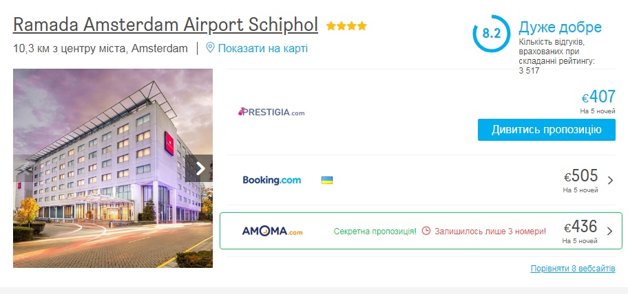 Для комфортнішого проживання – Ramada Amsterdam Airport Schiphol – від €576 за двомісний номер.
