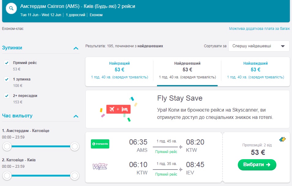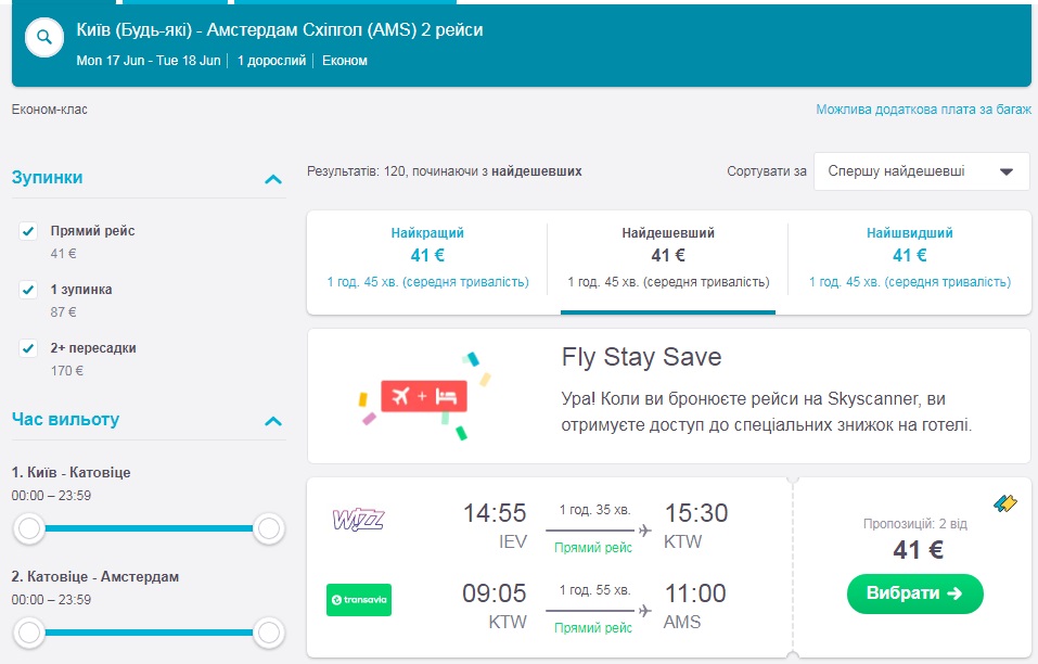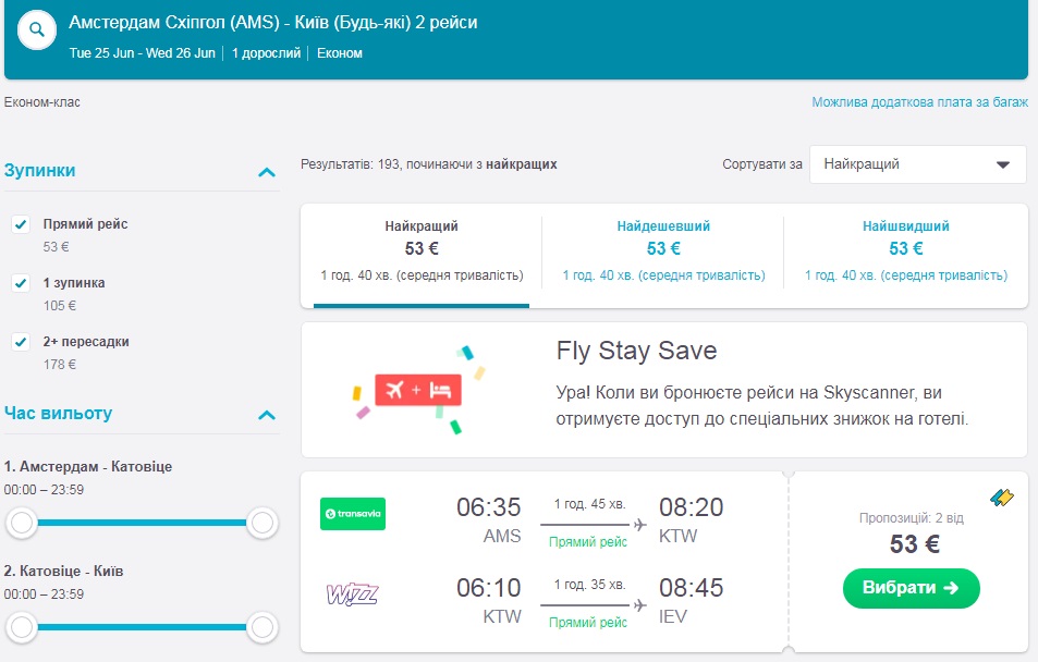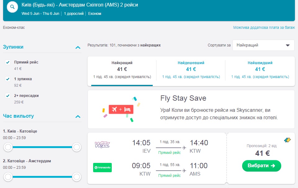 Амстердам-Катовіце-Київ (25.06.-26.06.2019) – €53