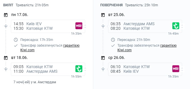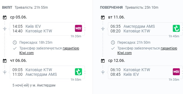 Переліт з Києва в Амстердам здійснюється з пересадками у Катовіце.
