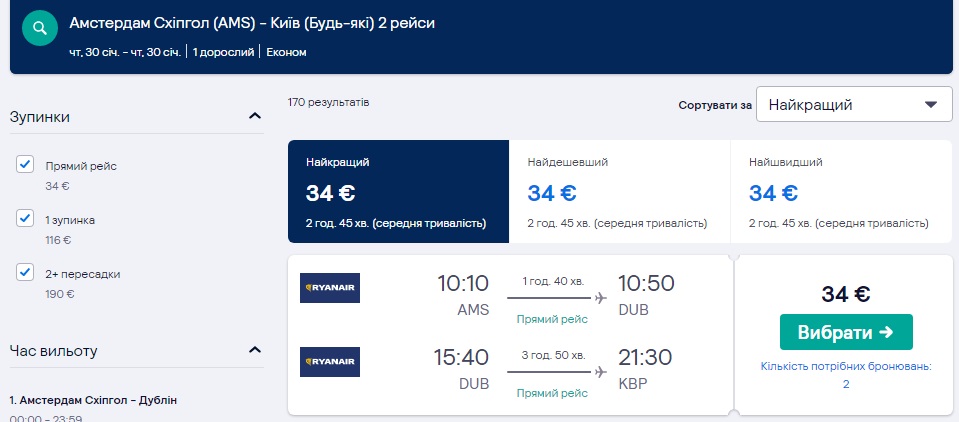 Амстердам-Дублін-Київ (30.01.2020) – €34