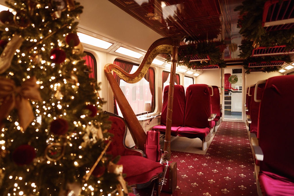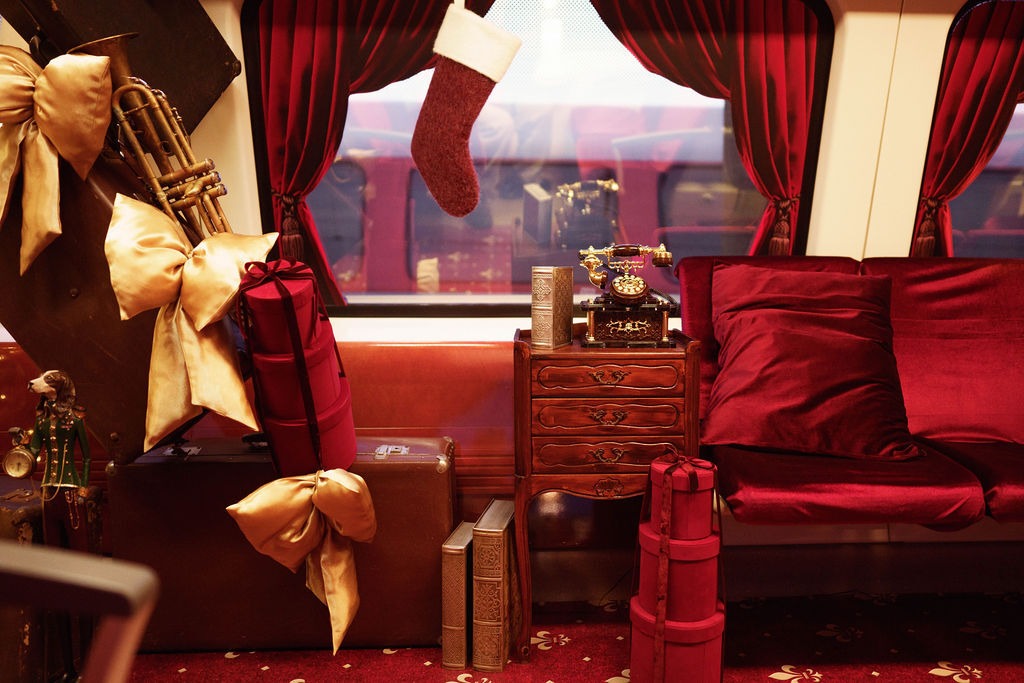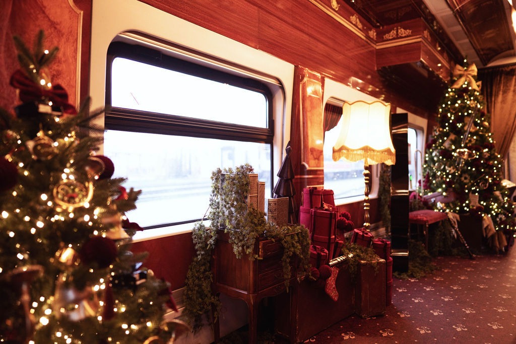 У вагонах створено справжній святковий антураж: червоно-золоті прикраси, різдвяні ялинки, музичні інструменти, фігурки з пряників та навіть поштова скринька для листів Санта-Клаусу.