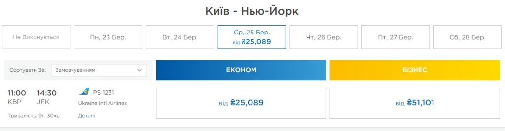 Авіаквитки Київ-Нью-Йорк коштують 25089 грн для польотів в економ-класі і 51101 грн в бізнес-класі.