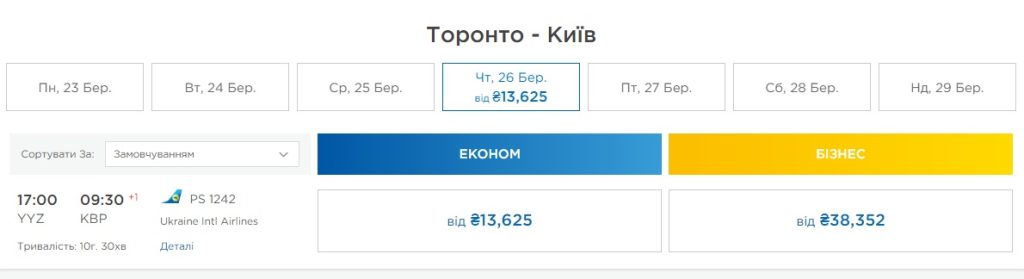 Переліт з Києва в Торонто – 18700 грн в економ-класі, 38400 грн – в бізнес-класі. На шляху з Канади в Україну квитки коштують 13625 грн в економ-класі і 38400 грн в бізнес-класі.