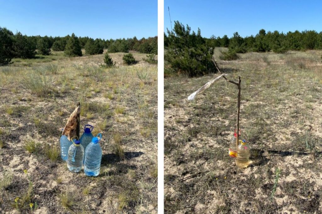 Водночас пожежна небезпека залишається високою. Окрім погоди, природі загрожують постійні прильоти. Місцеві мешканці роблять пожежні “агрегати” з баклажок від води та розставляють їх навколо села. Кажуть, краще було б і лопати поряд залишитись, але бояться залишитись і без них.