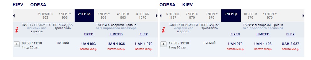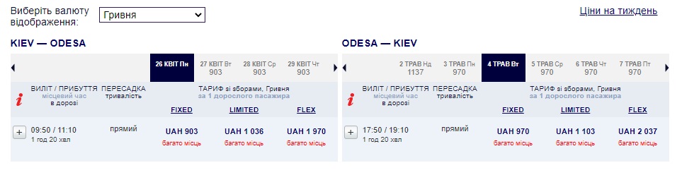 Вартість перельотів Київ – Одеса – від ₴903 в одну сторону або ₴1873 туди-назад. За найнижчими тарифами – тільки ручна поклажа до 5 кг.