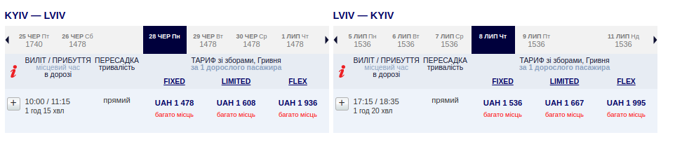 Вартість перельотів Київ – Львів – від ₴1478 в один бік або ₴3014 туди-назад. В найдешевших тарифах – тільки ручна поклажа до 5 кг. Планувати подорожі можна протягом червня – жовтня 2021.
