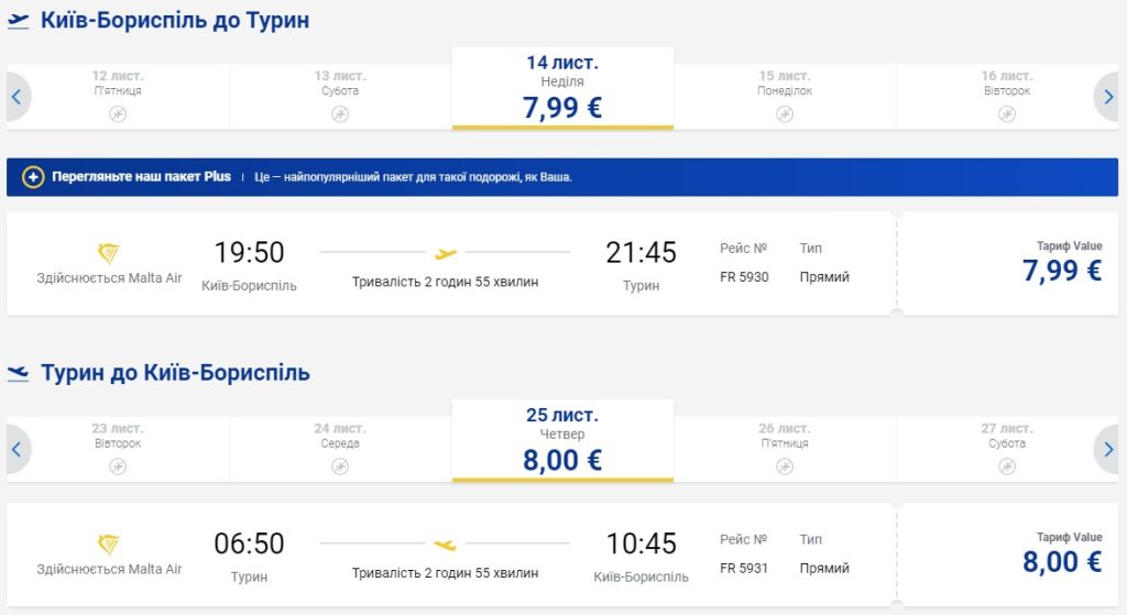 Київ – Турин – Київ (14.11.2021 – 25.11.2021) – €16
