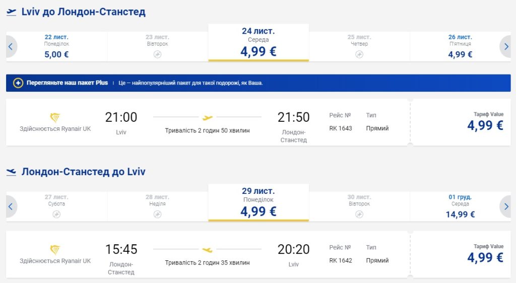 В ціні за даними тарифами – тільки ручна поклажа. Замовляти квитки потрібно на сайті Ryanair.