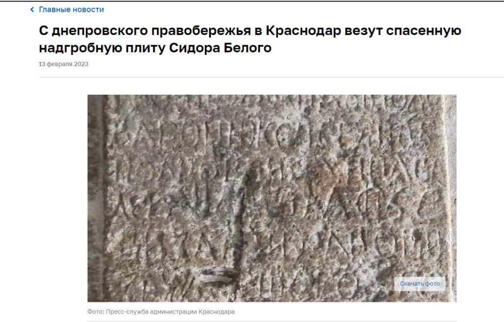 Краснодарська адміністрація опублікувала інформацію начебто про вивезену надгробну плиту козацького отамана Сидора Білого з Кінбурнської коси. Однак, надгробок належить не тій людині.