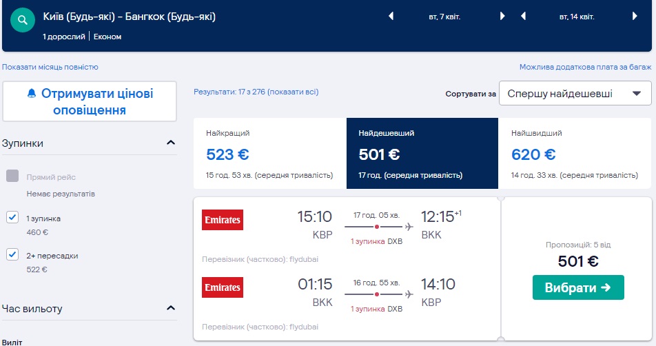 Вартість квитків з Києва в Бангкок, Сингапур, Ханой – від €501 в обидві сторони, або на острови Балі, Мальдиви, Пхукет – від €634 туди-назад. В ціні – зареєстрований багаж, ручну поклажу та харчування під час перельотів. Усі авіарейси здійснюються з пересадками у Дубаї. Переліт частково виконує авіакомпанія Flydubai.