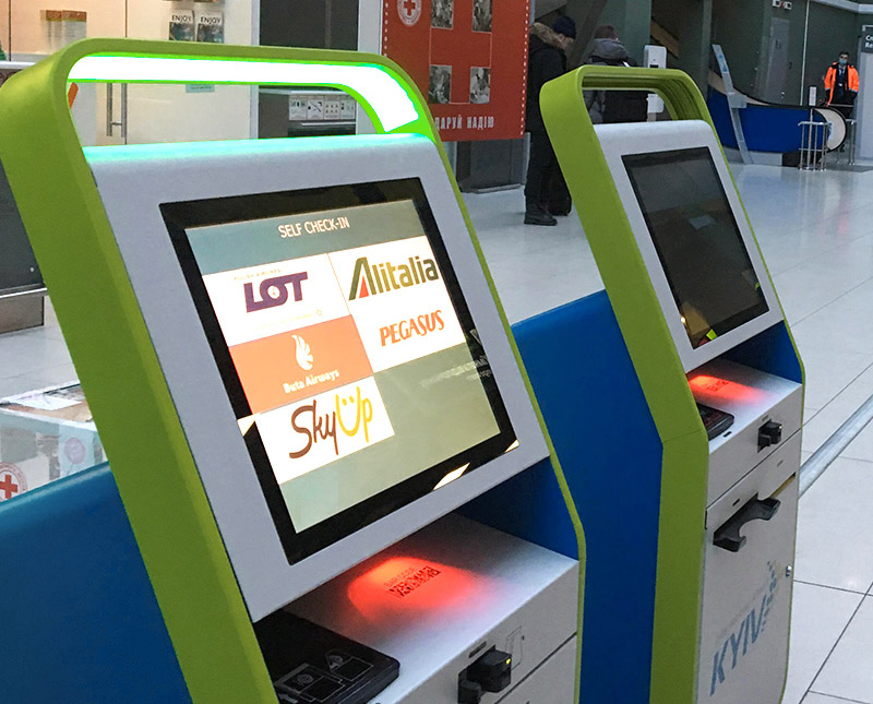 Такі кіоски встановили в залі вильоту міжнародного терміналу аеропорту «Київ» у Жулянах в кінці 2017 року. На даний момент, з їх допомогою можуть зареєструватись пасажири авіакомпаній SkyUp, Alitalia, LOT, Pegasus Airlines, Buta Airways.