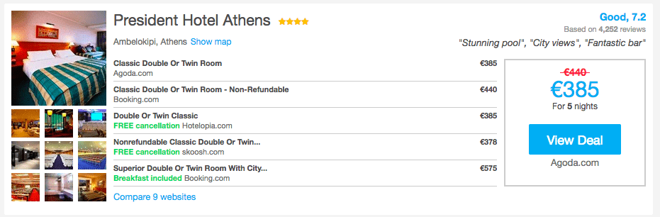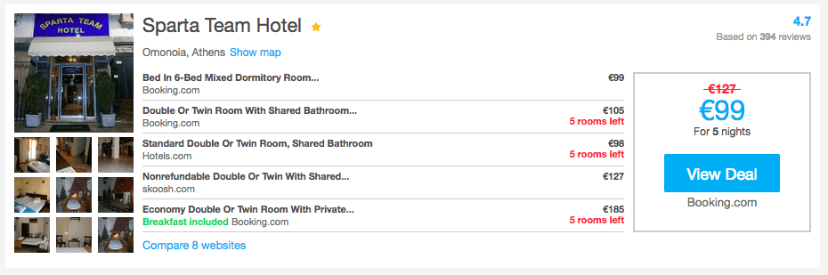 Шукати найвигідніший варіант житла рекомендуємо на сайті Hotelscombinet.com, який порівнює ціни популярних сервісів бронювання таких як Booking.com, Agoda.com та інші. Ось приклади цін бронювання житла в Афінах на двох на 5 діб: