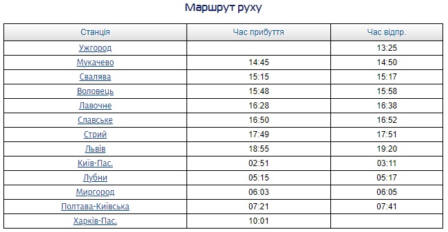 Сьогодні перший рейс вирушить з Ужгорода о 13:25 та прибуде до Харкова вже завтра о 10:01. Поїзд робить зупинки у Львові, Києві, Миргороді та Полтаві.