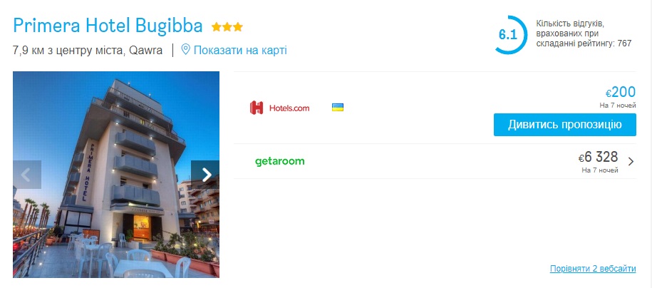 Для комфортнішого проживання – Primera Hotel Bugibba – від €200 за двомісний номер.
