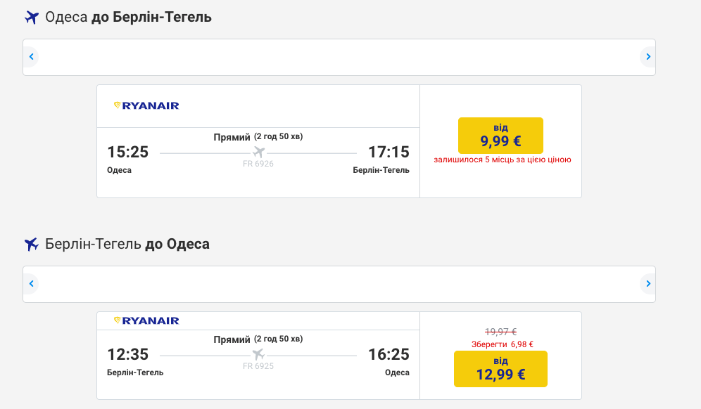 З’явилися вигідні прямі авіа лоукостера Ryanair з Києва та Одеси до Берліна від €10 в один бік. Квитки за такою ціною доступні на кілька дат в грудні, січні та лютому. У вартість входить лише перевезення ручної поклажі.