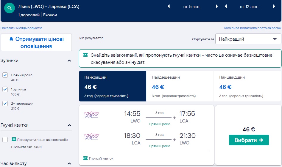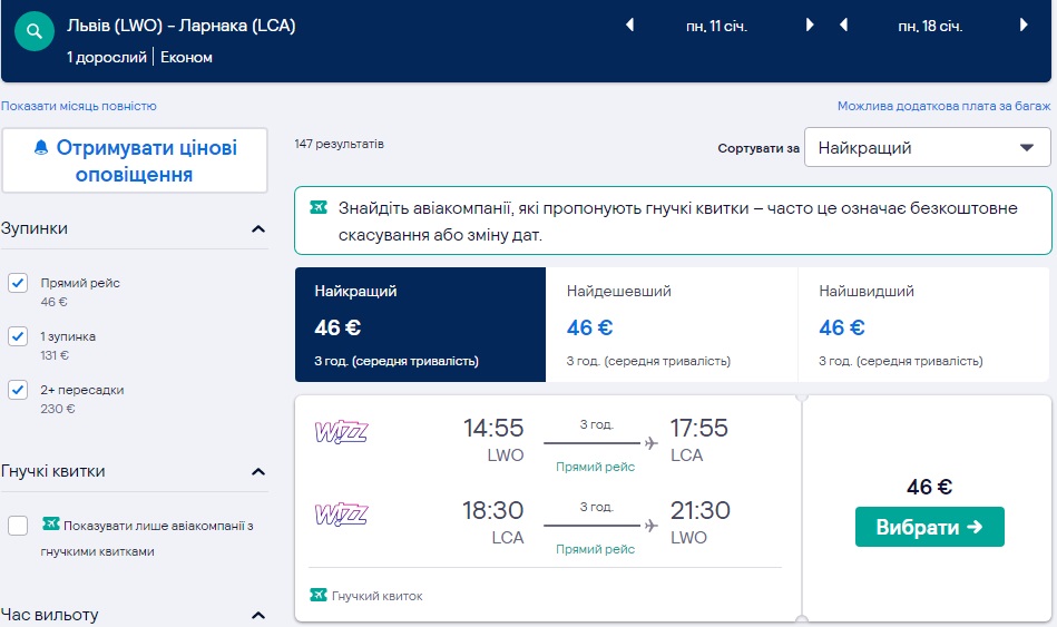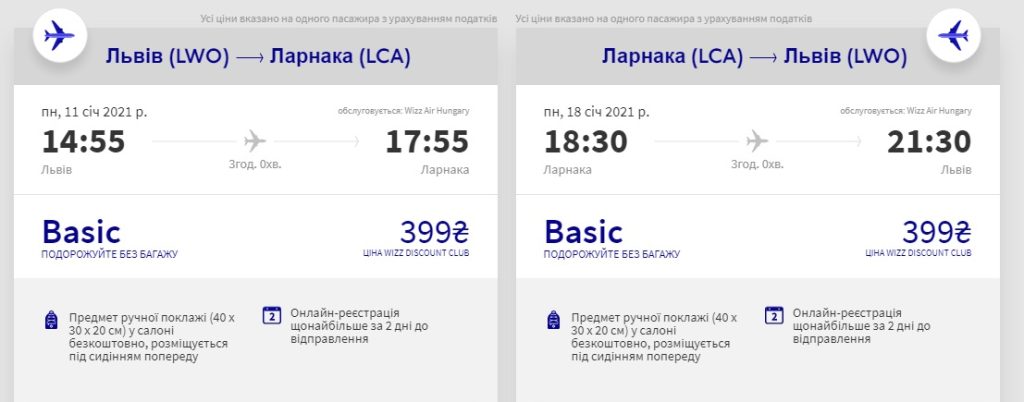 Вартість авіарейсів Львів-Ларнака – від €46 в обидві сторони, а для учасників Wizz Discount Club – від €27 туди-назад.