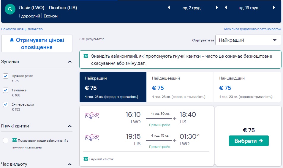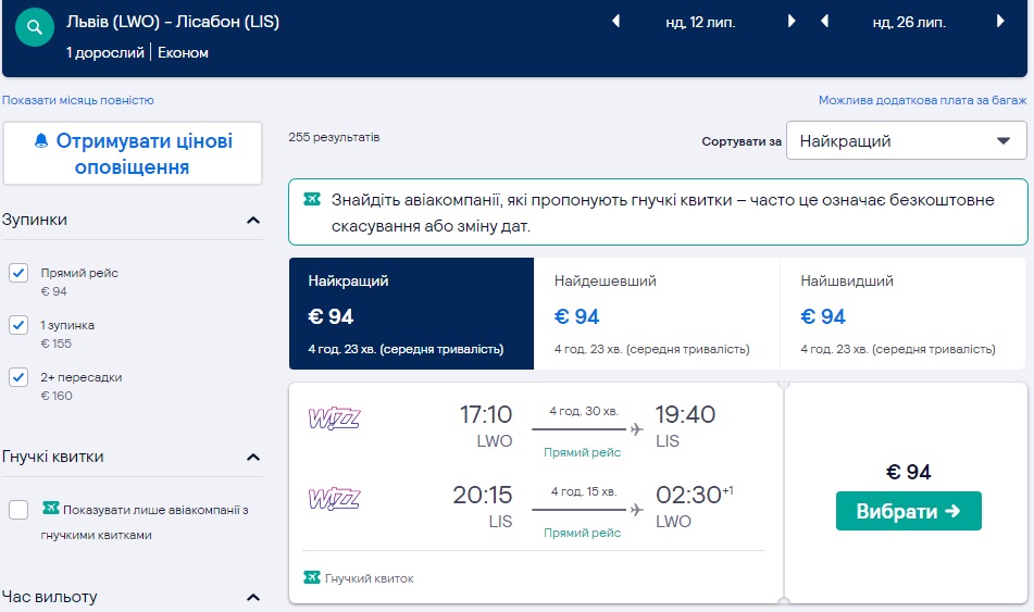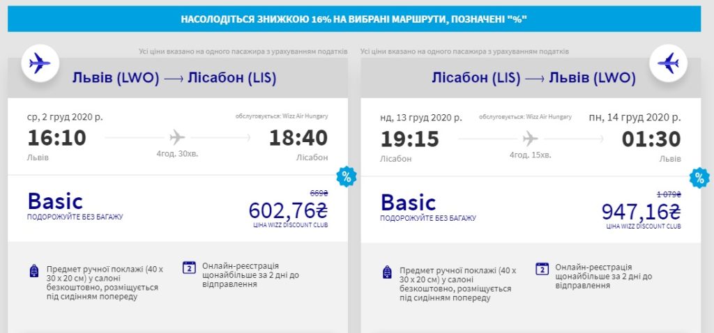 Вартість квитків на прямий переліт зі Львова у Лісабон – від €54 для учасників Wizz Discount Club або €75 для всіх.