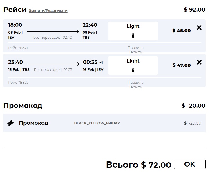 Для отримання знижки потрібно обрати рейс та на етапі “Оплата” ввести промокод: BLACK_YELLOW_FRIDAY. Знижка 50% поширюється на вартість тарифу, але не діє на аеропортові збори.