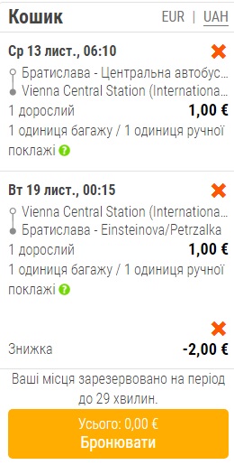 Завдяки цьому промокоду є можливість забронювати безкоштовні квитки на деяких напрямках, наприклад з Братислави у Відень, якщо знайти рейси по €1.