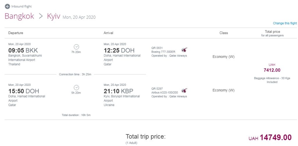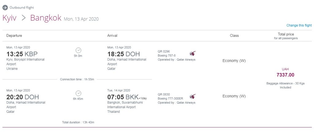 Київ-Бангкок-Київ (13.04.2020 – 20.04.2020) – €555