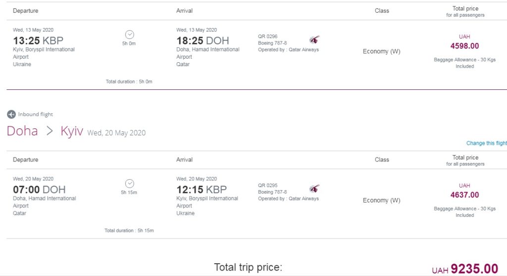 Київ-Доха-Київ (13.05.2020 – 23.05.2020) – €347