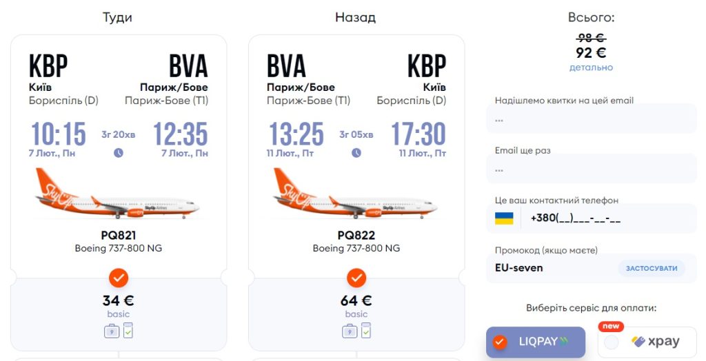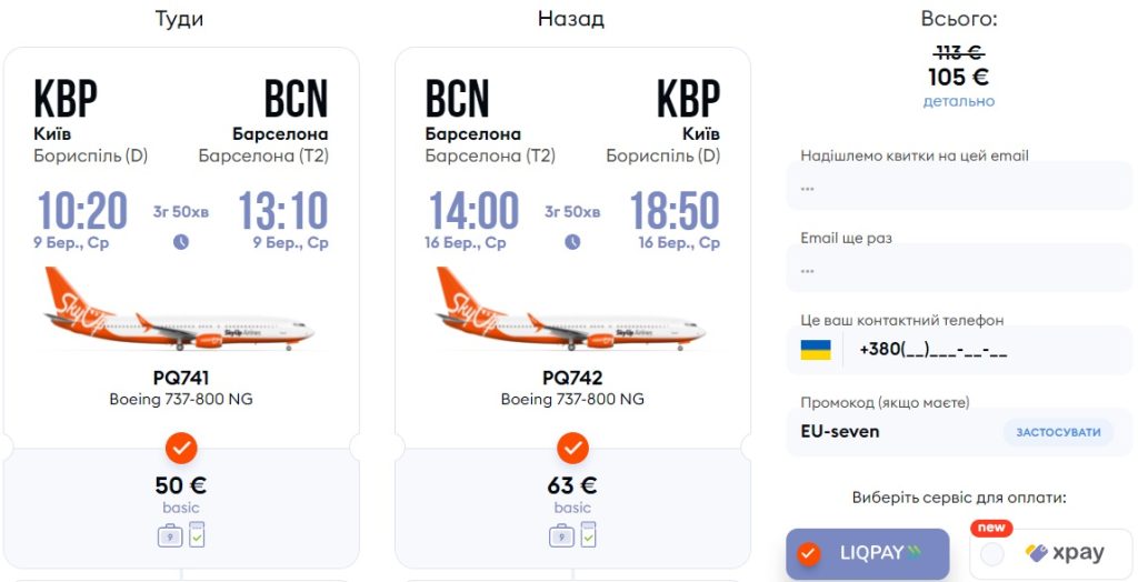 Для застосування знижки, потрібно обрати рейси та на етапі “Оплата” внести промокод: EU-seven.