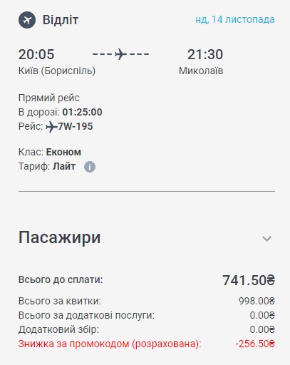 Для того, щоб скористатись знижкою потрібно на етапі “Оплата” ввести промокод AUTUMNWINDROSE. Промокод діє тільки для одного пасажира в одну сторону в тарифах “лайт” або “стандарт”.
