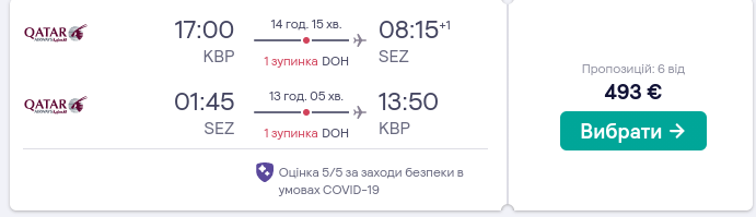 Вартість квитків з Києва на острів Мае – від €493 в обидві сторони. В ціні зареєстрований багаж та ручна поклажа. Крім того, Qatar пропонує необмежені безкоштовні зміни дати перельотів або пунктів призначення. Авіарейси з Києва виконуються з пересадками в аеропорту Доха (Катар).