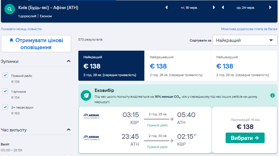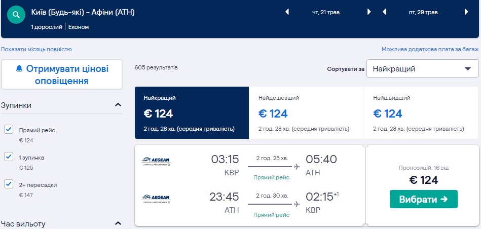Замовляти квитки потрібно на сайті Aegean Airlines або можна скористатись сервісами Skyscanner.com чи Kiwi.com.