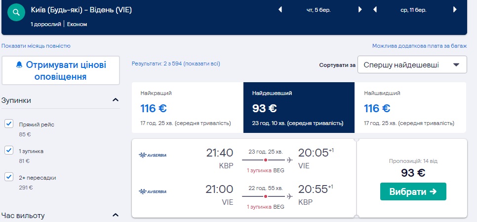 Рейси на акційні напрямки до Італії та Австрії здійснюються з пересадками у Белграді.