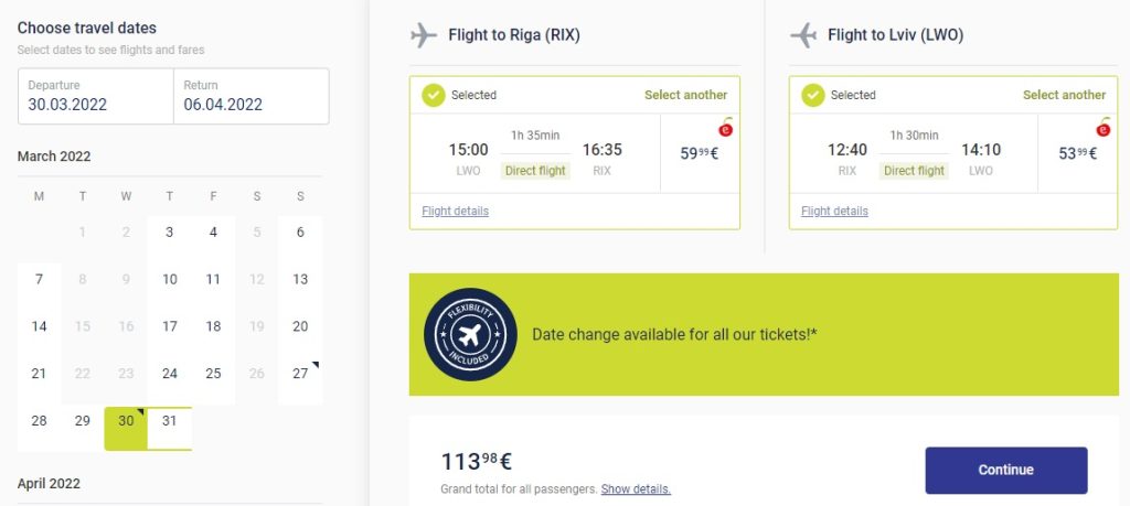 Львів – Рига – Львів (30.03.2022 – 06.04.2022) – €114