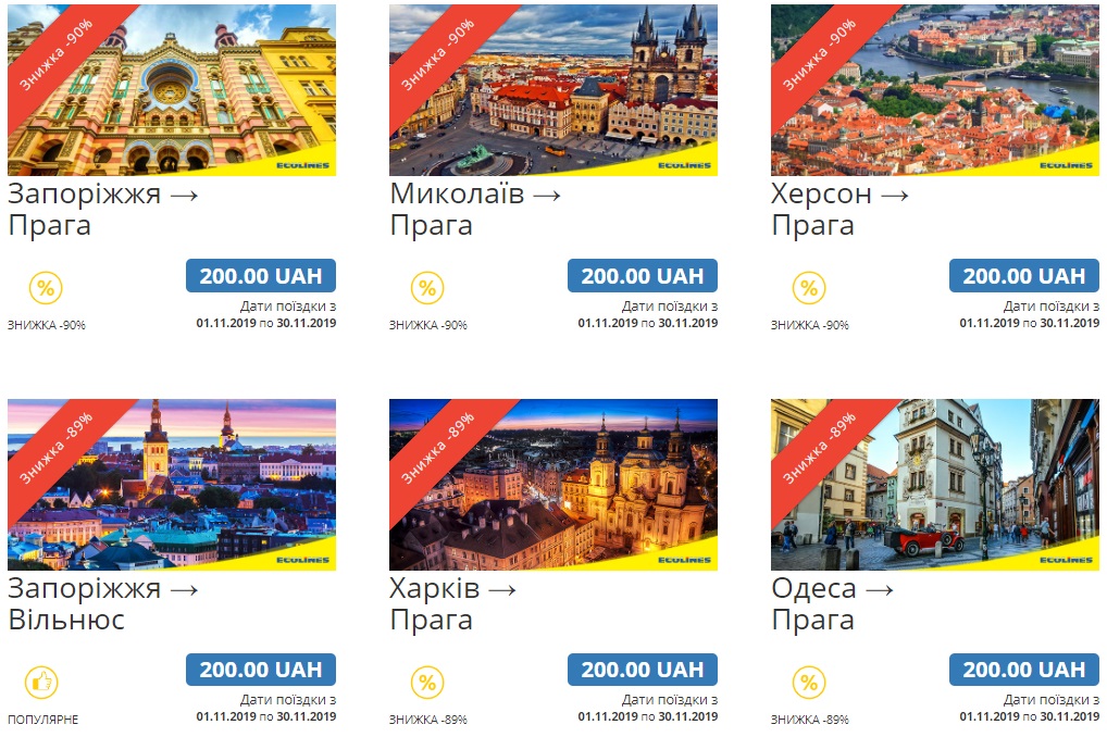 Автобусний перевізник Ecolines запустив новий розпродаж квитків на автобусні рейси з різних міст України до Польщі, Чехії та Литви за ₴200 в одну сторону.