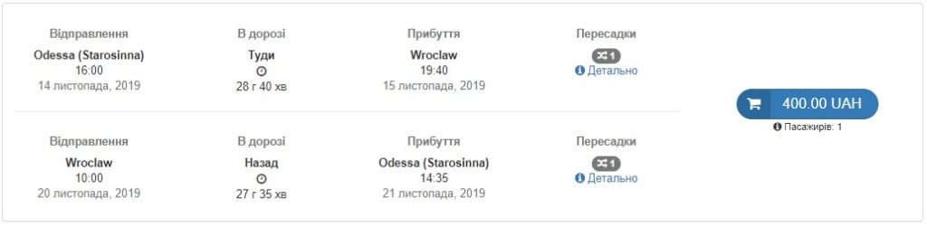 Одеса-Вроцлав-Одеса (14.11.2019 – 20.11.2019) – ₴400