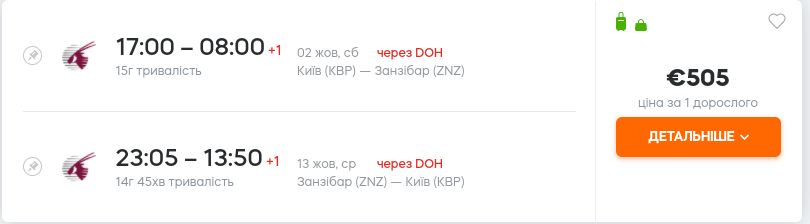 Летіти з Києва можна на Мальдіви, Занзібар, Сейшели, Найробі, Пхукет, Бангкок, Коломбо, Балі, Мускат — від €290 в один бік. Рейси виконуються з пересадками в аеропорту Доха (Катар).