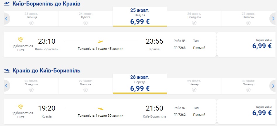 В ціні тільки подорож з ручною поклажею. Замовляти квитки потрібно на сайті Ryanair.