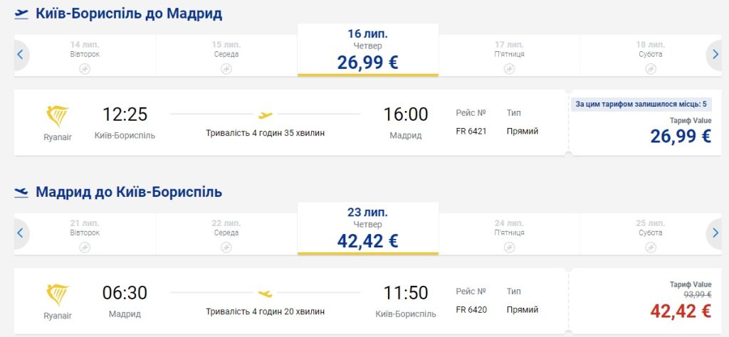Київ-Мадрид-Київ (16.07.2020 – 23.07.2020) – €70