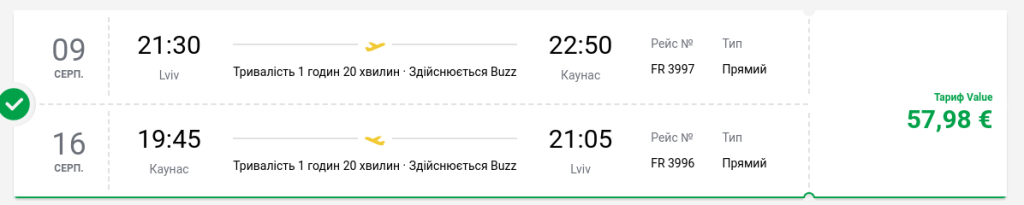 Вартість перельотів Ryanair Львів – Каунас – від €29 в одну сторону. Рейси відкриють 2 липня та виконуватимуть двічі на тиждень – щопонеділка та щоп’ятниці.