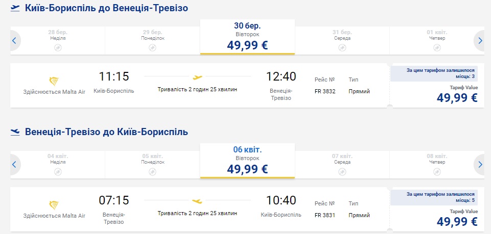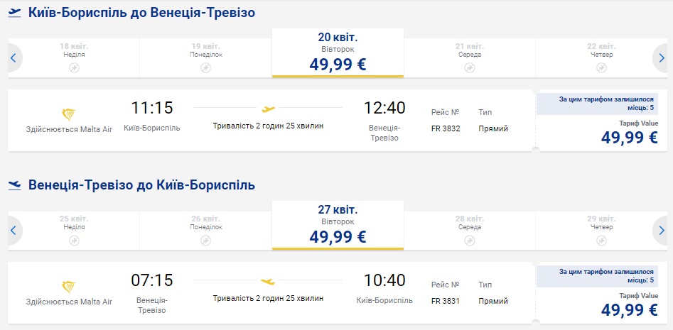Прямі перельоти Київ – Венеція виконуватимуться двічі на тиждень – по вівторках та суботах. Вартість квитків – від €50 в одну сторону.