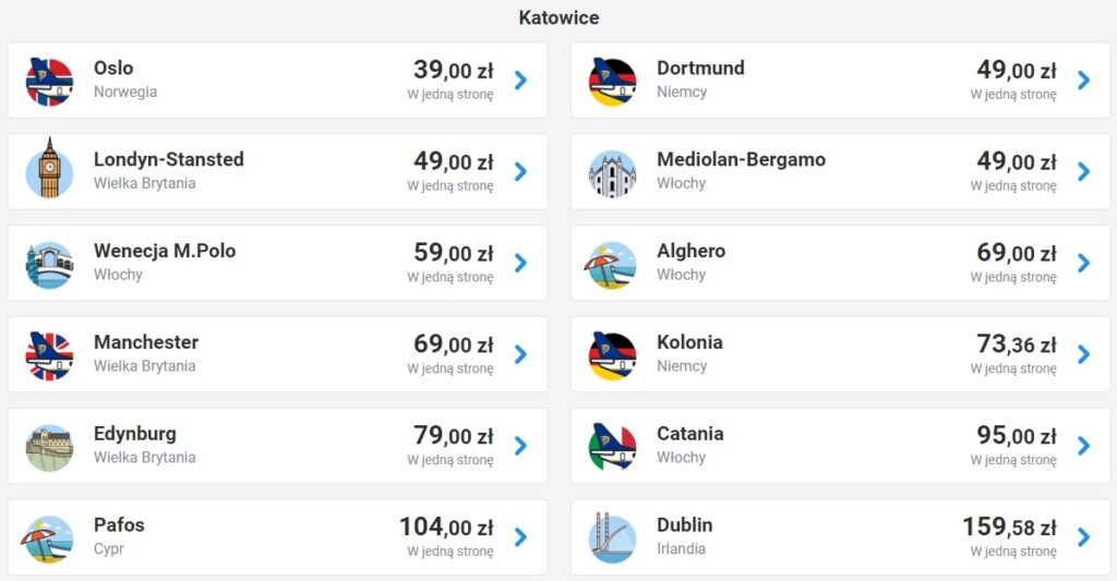 Ірландський лоукост пропонує вигідні перельоти з Катовіце до міст Німеччини, Норвегії, Італії, Кіпру та Великобританії.