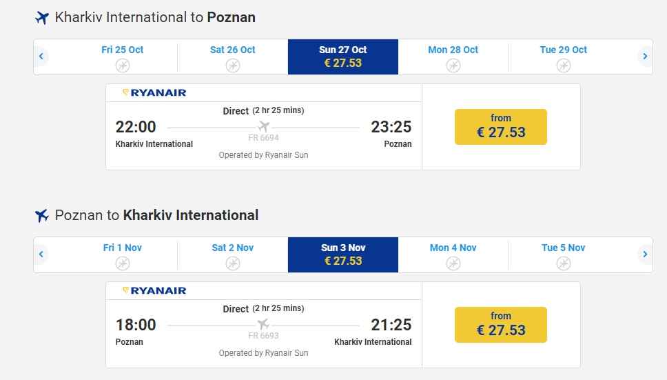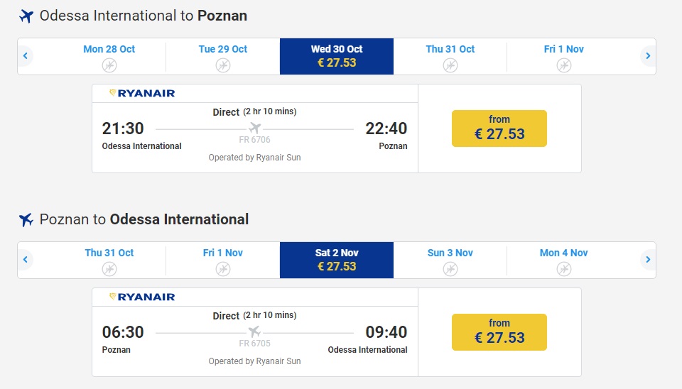 Прямі рейси з Харкова у Познань розпочнуть виконуватись з 27 жовтня 2019, двічі на тиждень по вівторках та неділях. З Одеси у Познань – з 30 жовтня 2019, два рази на тиждень – по середах та суботах.