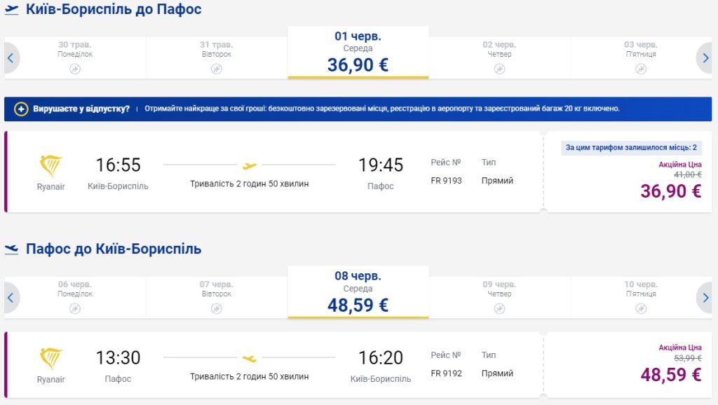 З України доступні акційні рейси Київ – Пафос – від €37 в один бік або €74 туди-назад. В найдешевших тарифах – тільки ручна поклажа.