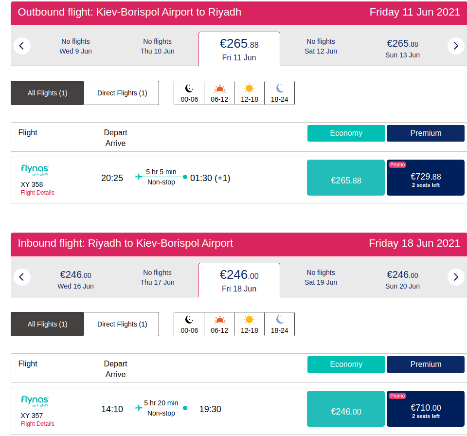 Саудівський лоукост Flynas планує виконувати три рейси на тиждень – по середах, п’ятницях та неділях. Період для подорожей: червень – вересень 2021.