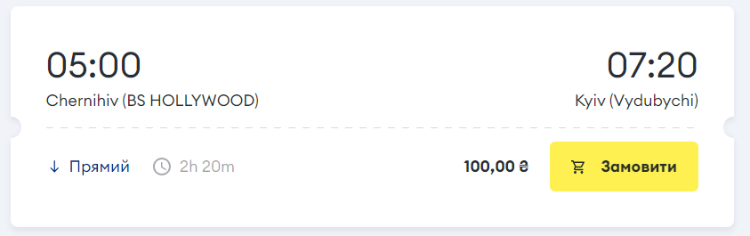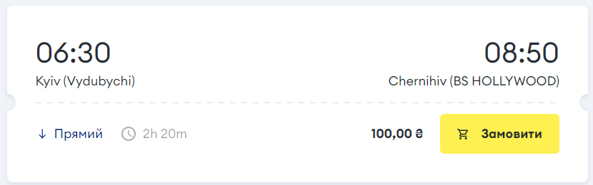 Відправлення Київ: Автостанція “Видубичі”, Набережно-Печерська дорога, 10 А. Прибуття Чернігів: вул. 77-ї Гвардійської Дивізії 1В.