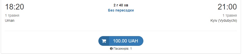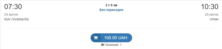Відправлення з Києва: Автостанція “Видубичі”, Набережно-Печерська дорога, 10 А. Прибуття в Умань: Автовокзал, вул. Київська, 1, пл. 13. Орієнтовний час в дорозі Київ — Умань: 2 г 41 хв.
