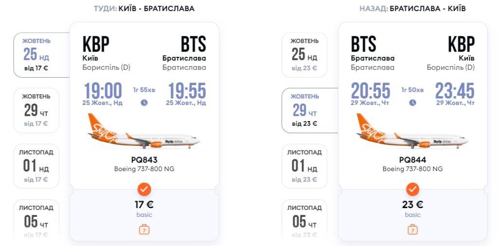 Вартість квитки Київ-Братислава – від €17 в один бік або €40 туди-назад.