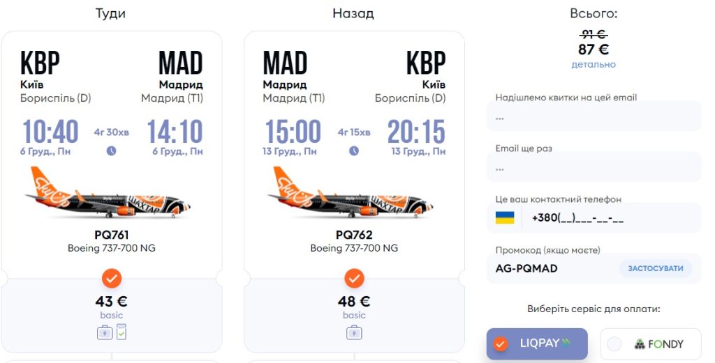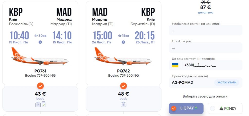 На честь відкриття нового сполучення SkyUp пропонує промокод AG-PQMAD зі знижкою 5% на квитки у Мадрид. Для застосування знижки потрібно на етапі оплати ввести промокод у відповідне поле.