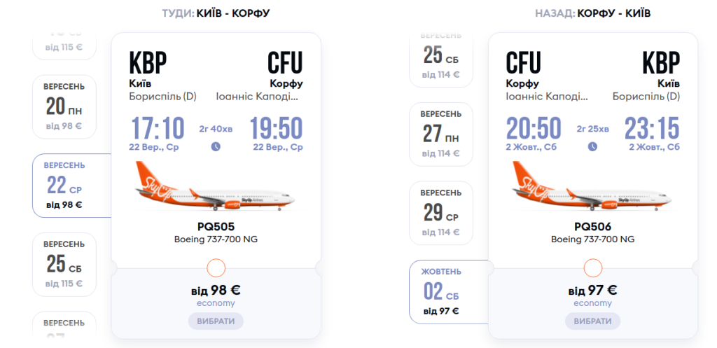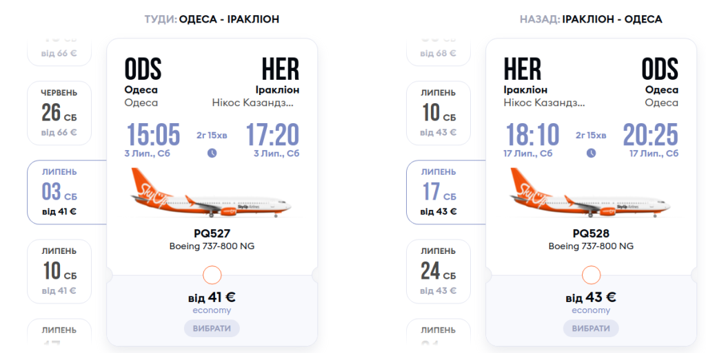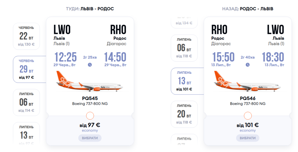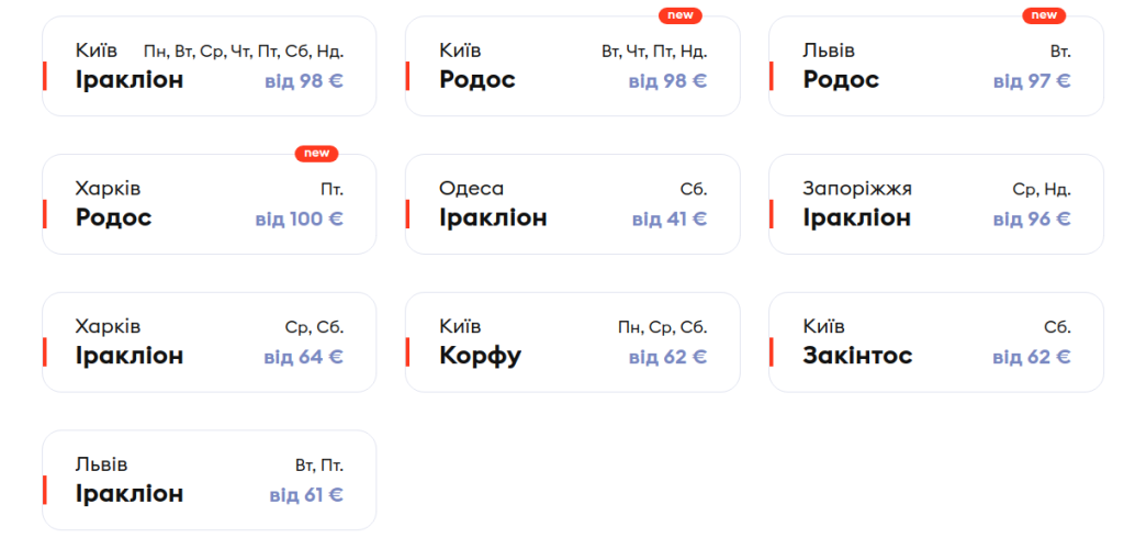 Летіти можна з Києва, Львова, Одеси, Запоріжжя та Харкова на Крит, Корфу, Закінтос та Родос.